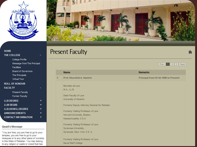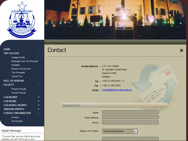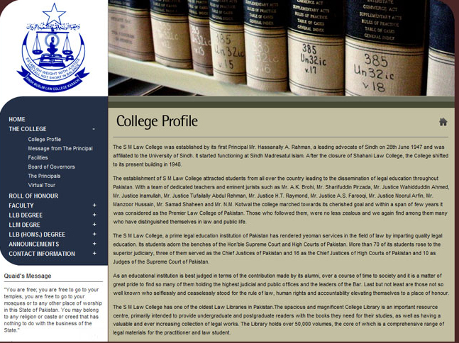 The S.M. Law College was established by its first Principal Mr. Hassanally A. Rahman, a leading advocate of Sindh on 28th June 1947 and was affiliated to the University of Sindh.